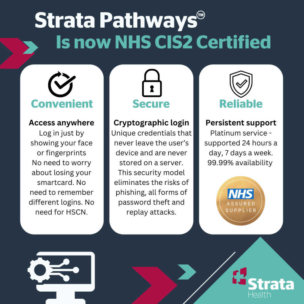London, UK – 26th July, 2024 – Strata Health UK is thrilled to announce that our flagship platform, Strata PathWays™, is now fully certified for NHS CIS2 (Care Identity Service 2) Authentication. This significant milestone underscores our commitment to enhancing healthcare delivery by providing secure, convenient, and reliable access to our services for health and care professionals across England.