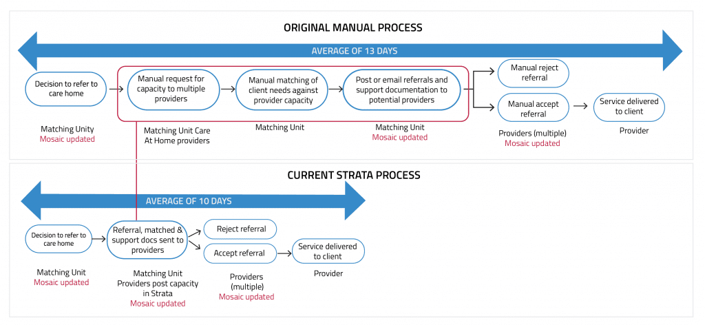 Figure 1 shows the original manual process compared to the current process under Strata, which demonstrates a 60% (6 day) time savings in completing a Residential Care placement.